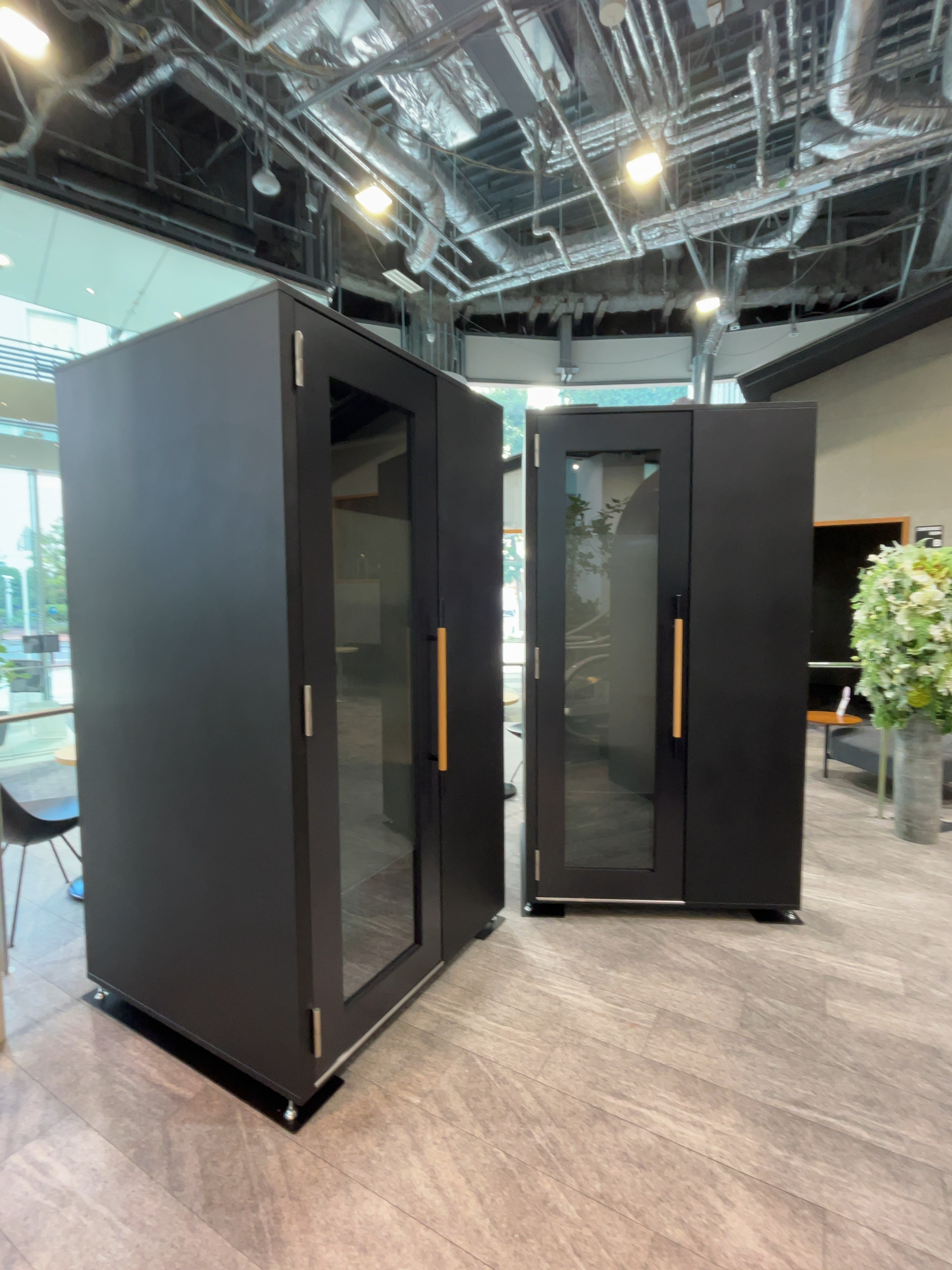 シェアオフィスSYNTHの2階フロアと、1階に新しく設置された有料テレフォンブース