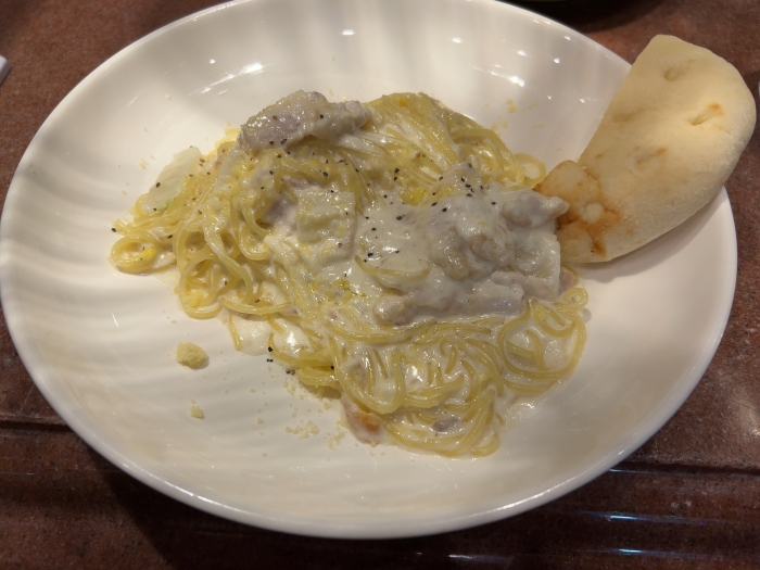 ランチメニューはいくつかありましたが、コワーキングオフィスSYNTHスタッフは、 生パスタランチのローストチキンと白菜のクリームソースを注文しました。 パンとサラダがセットでついてくるのが嬉しいポイントです。 注文して少し待っているとセットのサラダと、その後にメインのパスタが運ばれてきました。 食べてみると、パスタの麺は細めですが、噛むと弾力があって