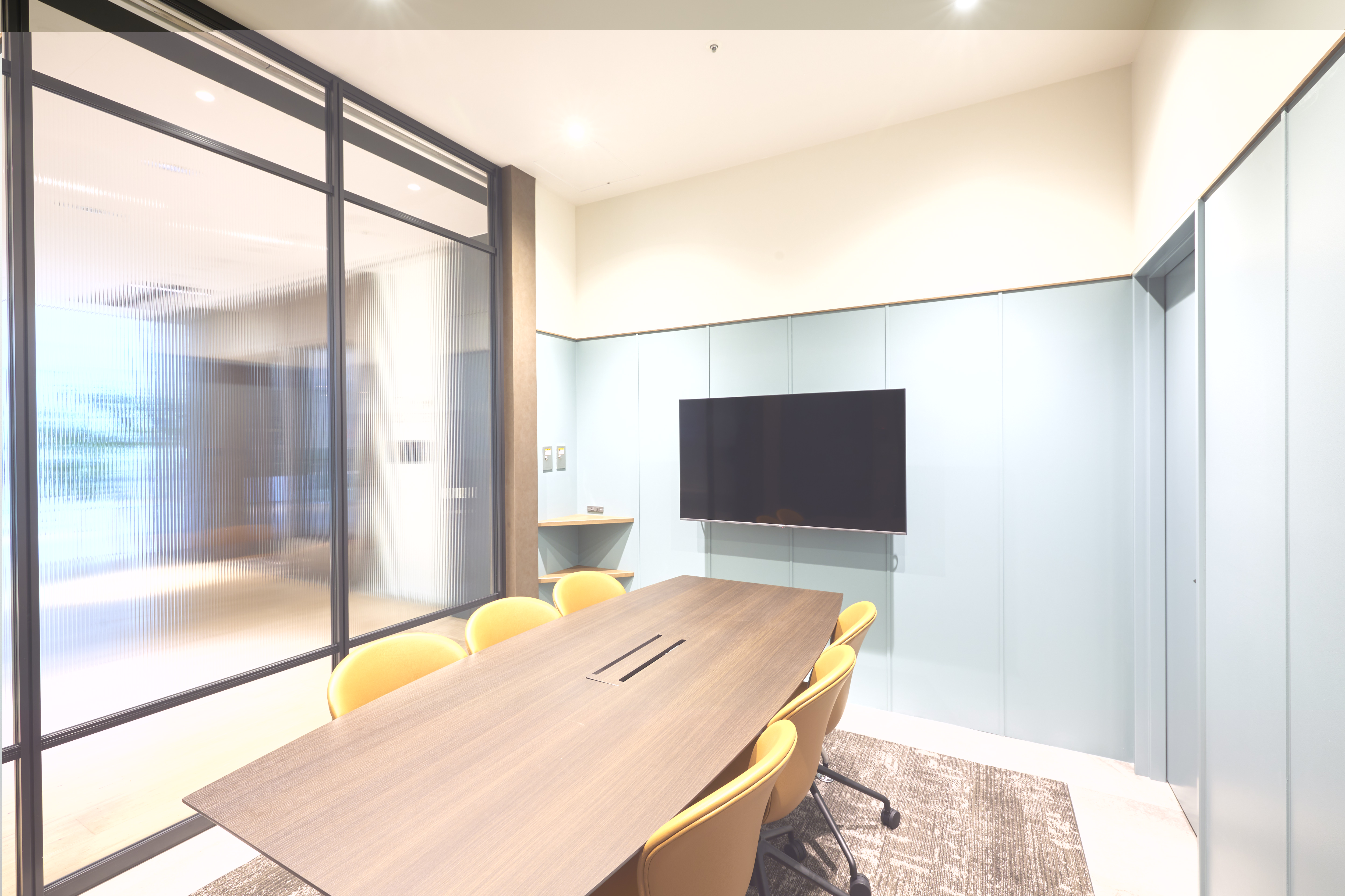 会議室Cは最大6名利用可能で 1500円/15分となっております。 重厚感のある扉が特徴の会議室Dは、外からも中からもぼやけて見える仕様で、 プライバシーを守りつつも閉塞感を感じさせない作りになっております。